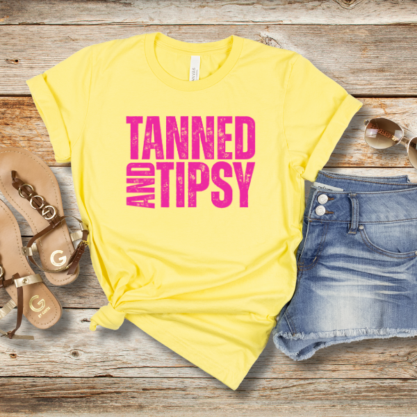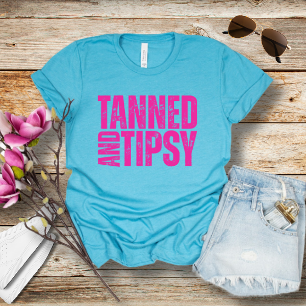 🍹 “Tanned and Tipsy” print in bold distressed pink lettering