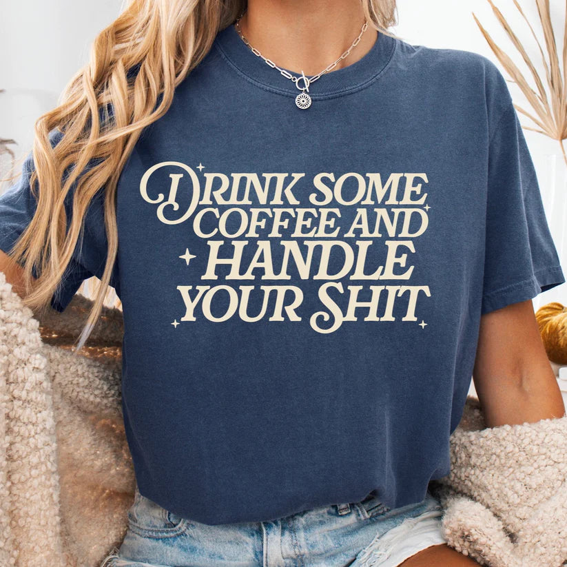 Start your day with a bold statement in this Comfort Colors unisex t-shirt. Featuring the empowering message "Drink Some Coffee And Handle Your Sh*t," it combines comfort and motivation to keep you focused and ready to tackle whatever comes your way. And there is nothing wrong with a little humor in your day to get you going. Made from soft, durable 100% cotton fabric, this shirt is perfect for everyday wear while reminding you to seize the day with confidence.