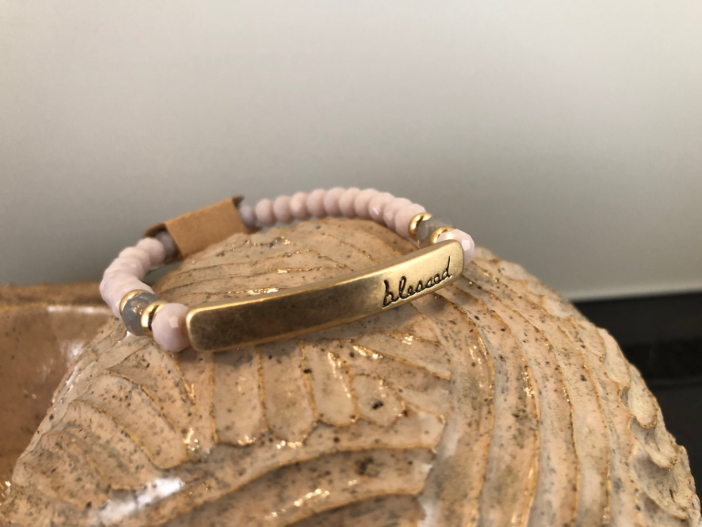 Beaded stretch bracelet with a bar focal, stamped with "blessed."